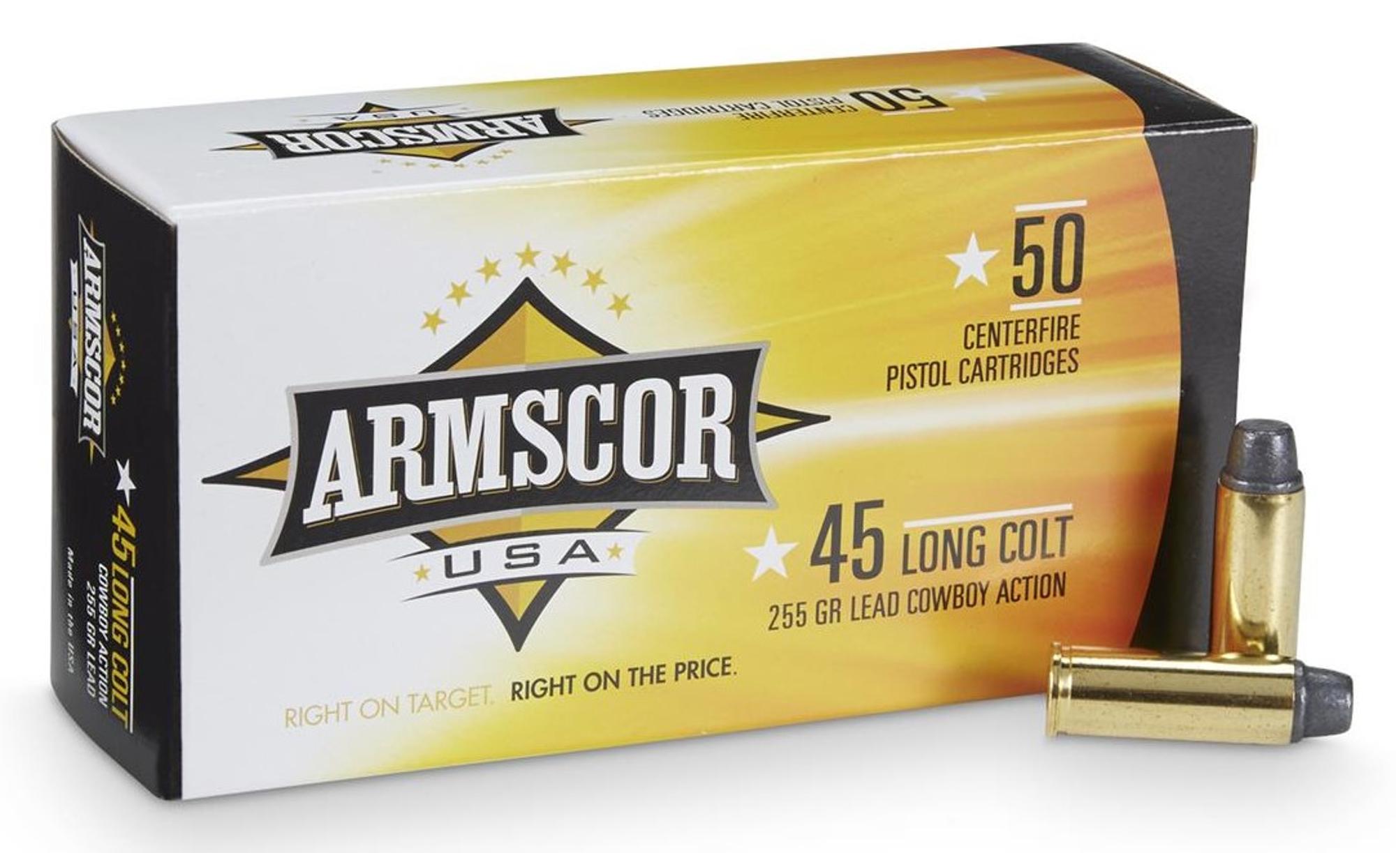 This is Armscor 45 Long Colt 255 Grain Lead Flat Nose Ammo.