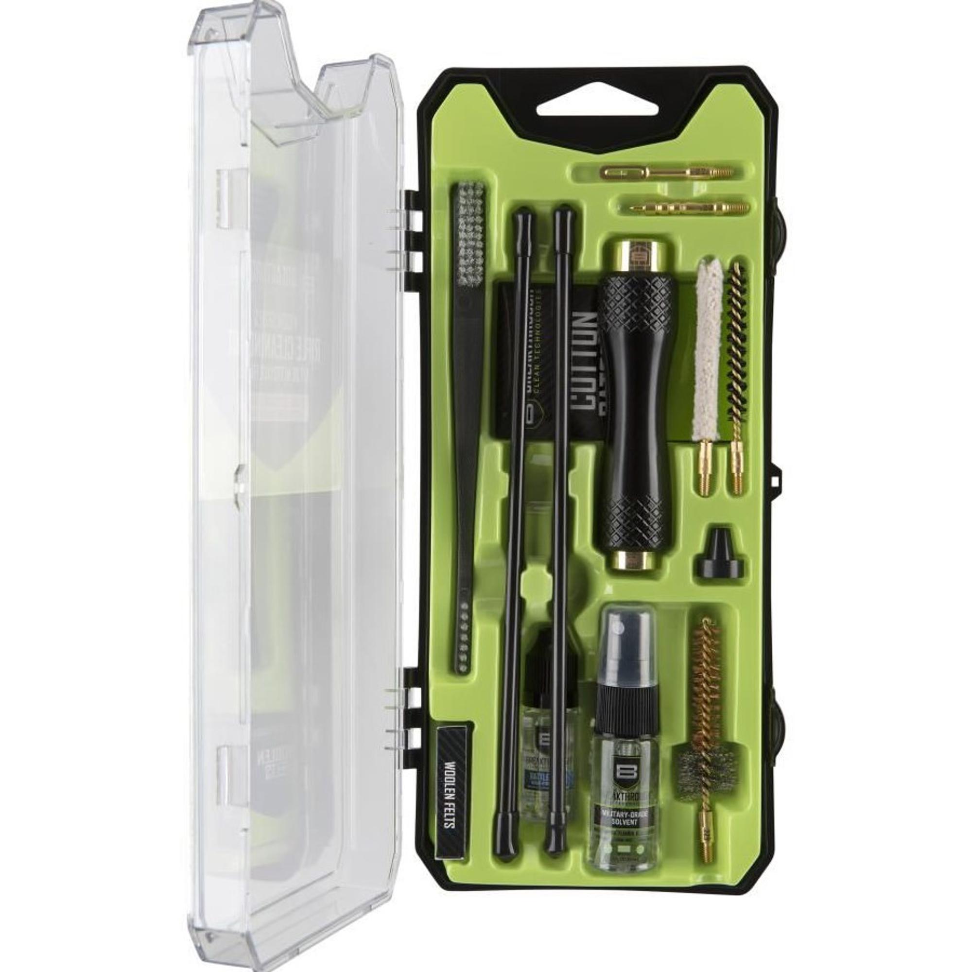 The compact Breakthrough Clean Technologies® Vision Series™ AR-15 Cleaning Kit offers you everything you need to ensure a thorough clean. Its plastic tray keeps all the various pieces of the kit organized neatly inside a durable case that acts like a mini toolbox. This AR-15 cleaning kit comes with cleaning rod sections, various hard bristle nylon brushes, jags, patch holders, and cotton patches. Also included is Breakthrough's durable and detachable aluminum handle with knurling for an easy grip and mini bottles of Breakthrough® Military-Grade Solvent and Battle Born High-Purity Oil. All of the rifle cleaning tools and supplies you need to keep your gun clean and functioning properly!
