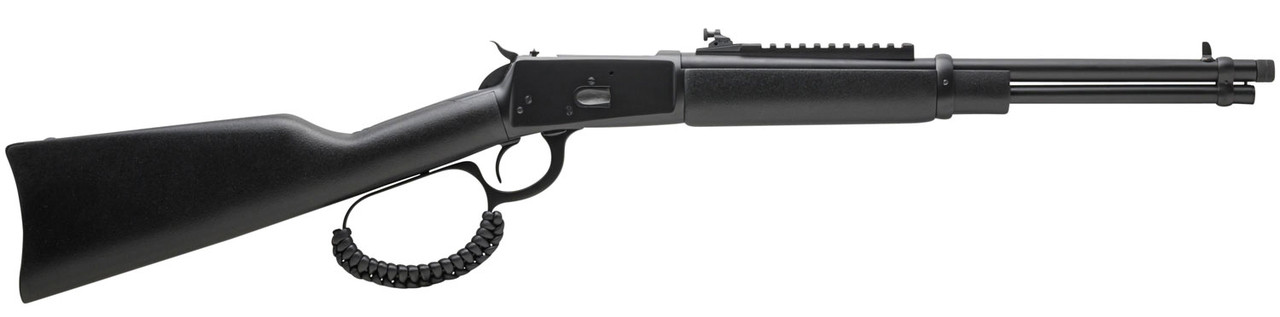 Rossi’s hard-use version of the R92 line. Black polymer furniture combined with a low-gloss blued metal finish, a forward mounted Picatinny rail for optics with an integrated peep sight, and a 16.5″ carbine-length barrel for easy handling and manipulation from tight quarters including vehicles. The barrel is also threaded, allowing for muzzle device attachment including sound suppressors. The 8+1 capacity gives the shooter plenty of shot opportunities before a reload is required. A paracord wrapped big loop lever is also included for the shooters comfort.