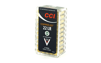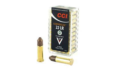 Get accurate, reliable performance on targets and small game in a non-lead, California-legal bullet with CCI Copper-22. The projectile is constructed from a unique mix of copper particles and polymer compressed into a potent, 21-grain hollow-point bullet. Combined with CCI’s reliable priming and propellant, Copper-22 loads achieve a muzzle velocity of 1,850 fps and provide superb accuracy.