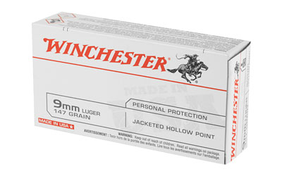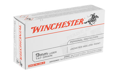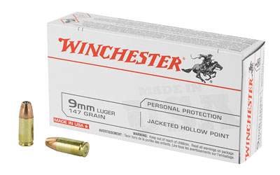 This is Winchester USA 9mm Luger 147gr Jacket Hollow Point Ammo – 50rd.
