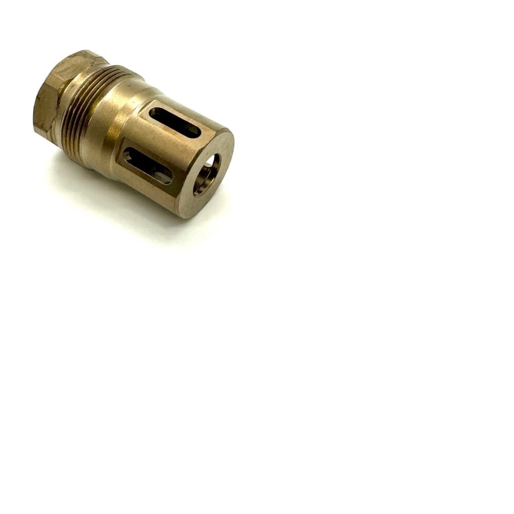 Natural variation in the heat treated finish is normal and purely aesthetic. It does not change the strength, performance, or overall effectiveness of the muzzle device. Features: All critical alignment features machined in one set up -Compatible with common .900″-24 silencer mounts (DDC ZILCH, Q PLAN B, REARDEN ATLAS) .33 bore for .30 cal or smaller projectiles 13/16″ rear hex for easy installation and removal CNC machined from 17-4 PH stainless steel, heat treated to H900 condition, 360 degree port orientation-no shims required, 1.9 ounces 1.45″ total length.