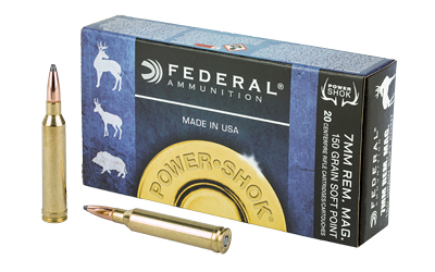 This is Federal Power-Shok 7mm Rem Mag 150gr Jacketed Soft Point Ammo – 20rd.