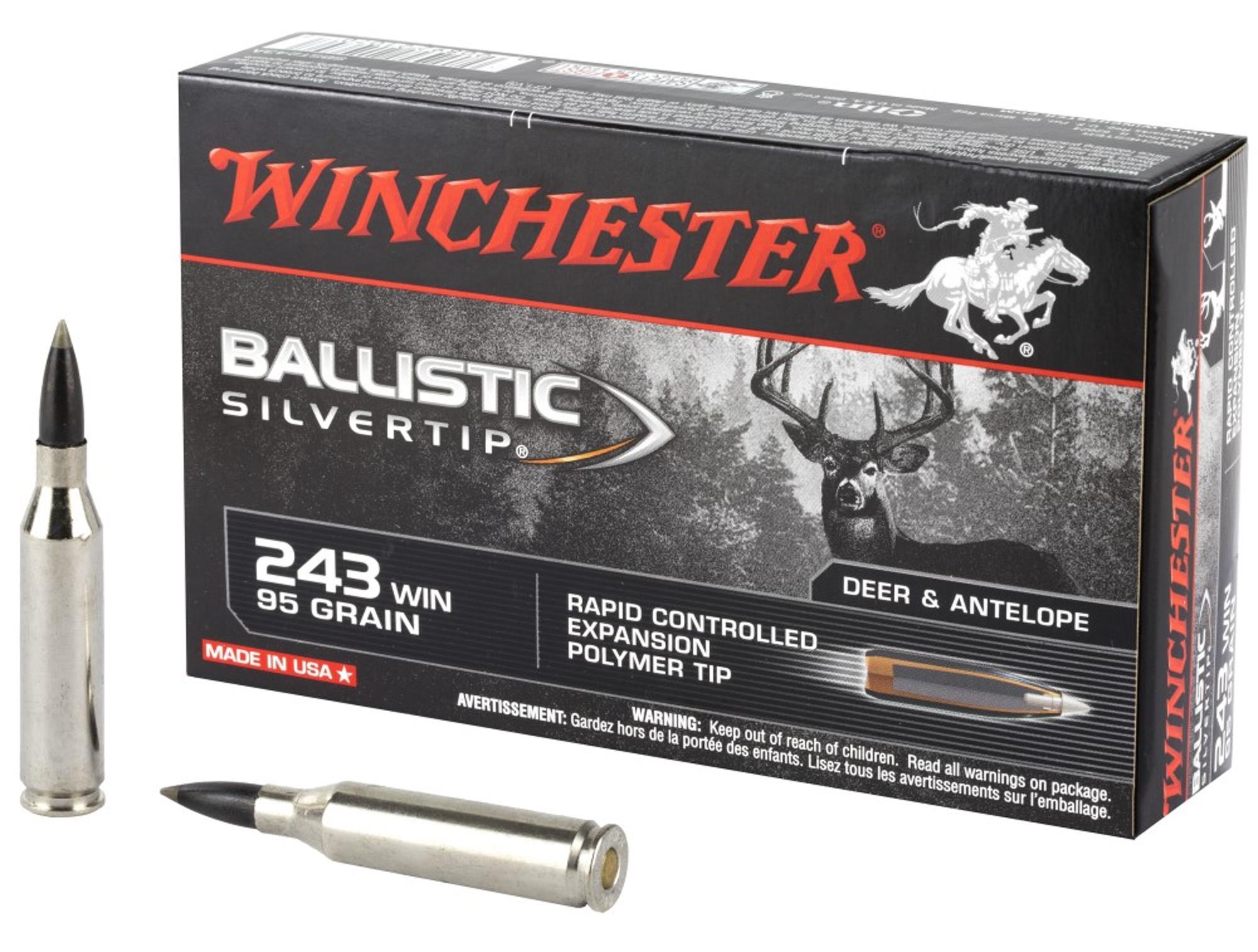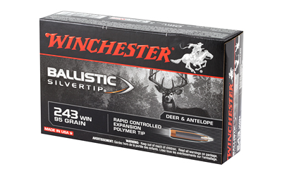 This is Winchester Ballistic Silvertip 243 Win 95 Grain Rapid Controlled Expansion Polymer Tip Ammo.