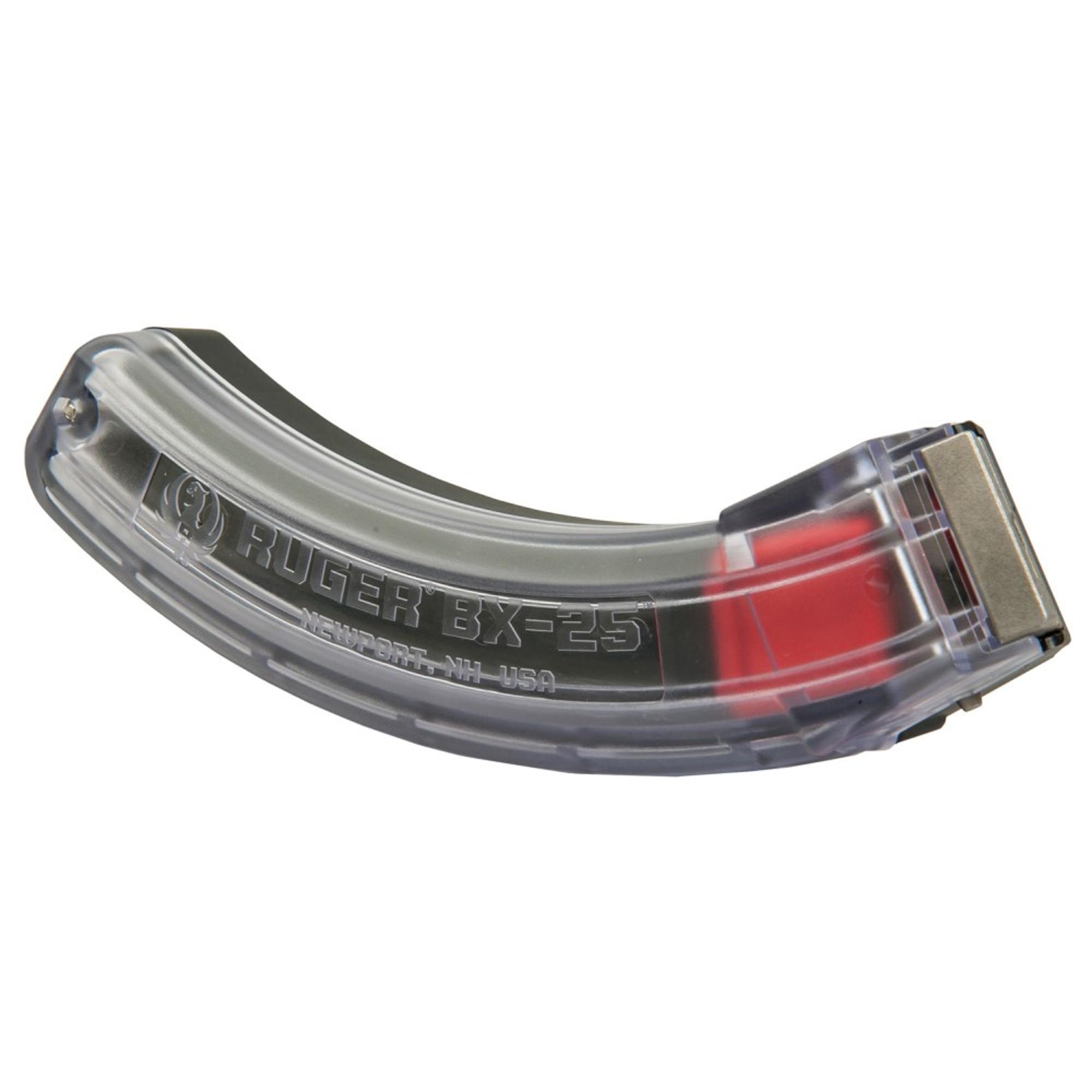 This genuine Ruger® factory magazine with Ruger logo has been tested and has proven to feed as reliably as the standard BX-1 10-round Ruger® rotary magazine. BX-25® magazines will work with any factory original 10/22® Rifle, SR-22® Rifle, 22 Charger™ Pistol, .22 LR Ruger American Rimfire® Rifle and .22 LR Ruger 77/22® Rifle.