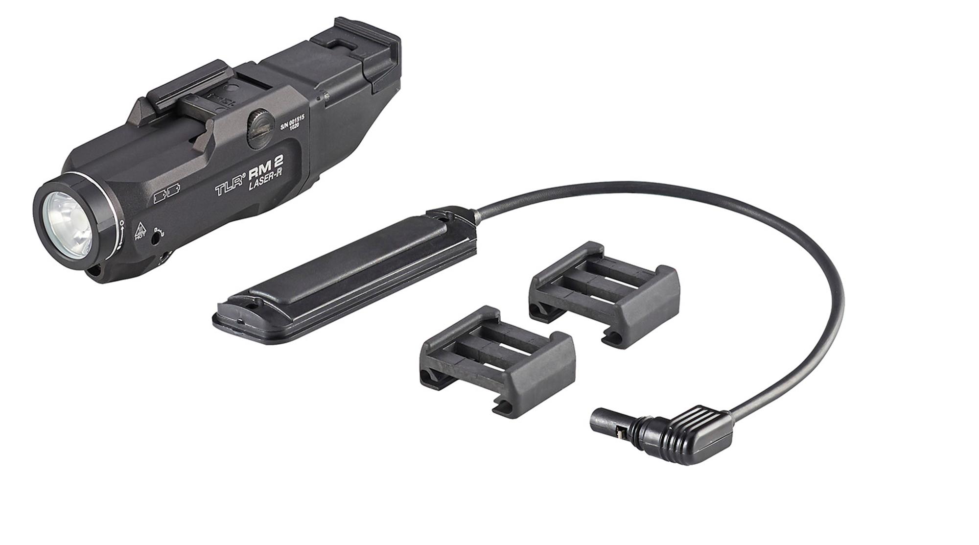 The TLR RM 2 Laser Lighting System with red laser features independently operating push-button and remote pressure switches. Packaged as a kit offering everything you need to mount to your long gun. Also featuring mode selector toggle switch for Laser only, Light only or Light/Laser combo; 200m beam; runs 1.50 hours (LED only or LED/Laser), runs 60 hours (Laser only), runs 3 hours (strobe); safe off feature prevents accidental activation and securely attaches to long guns with MIL Standard 1913 Rails. Includes remote pressure switch kit, key kit and CR123A lithium battery.