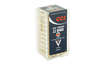This is CCI 22 WMR TNT Green 30gr. Lead-Free Hollow Point Ammo Unleash match-grade accuracy and maximum lethality on varmints in a non-lead bullet with CCI TNT Green. The load offers explosive expansion on impact and reliable CCI priming and brass. This product is sold 50 rounds per box.