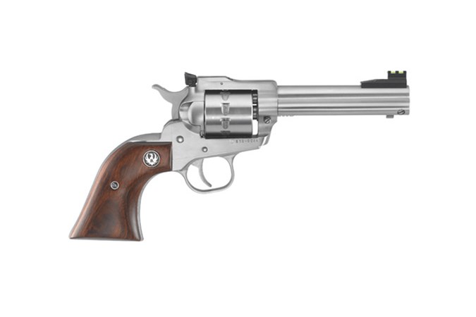The Ruger Single-Ten features a patented transfer bar mechanism and loading gate interlock that provide an unparalleled measure of security against accidental discharge. This particular model is in stainless, and has a cold hammer-forged barrel, Williams adjustable fiber optic sights, and hardwood gunfighter grips.